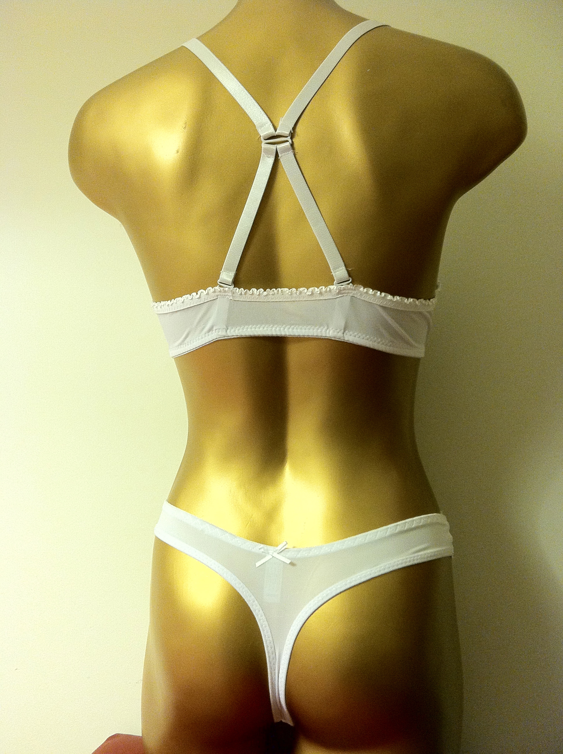Pretty panty with geometric stripe and floral lace, rhinestone and bow details. Available in Rust or White. Size Small.